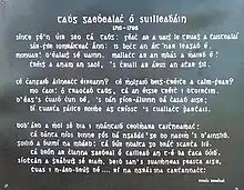 While manuscripts of Ó Súilleabháin's Christian poetry had already circulated before his death, and in 1802 a printed collection of twenty-five religious poems was published at Clonmel under the title Timothy O'Sullivan's Irish Pious Miscellany. Between 1816 and 1879 more than a dozen new editions of the Pious Miscellany were printed and sold in Clonmel, Cork City, Limerick, and Dublin, which leaves little doubt that it was the most widely read Irish-language book ever published before the later Gaelic revival.[4] A collection of Tadhg Gaelach's hymns were published by an tAthair Pádraig Ua Duinnín in Dublin in 1903.