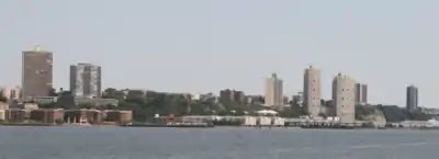 The area lies north of Hoboken and Jersey City, across the river from Midtown Manhattan and the Upper West Side in New York City, and east of the New Jersey Meadowlands. Its high elevation of about 260 ft (79 m)[1] affords North Hudson expansive views of the Manhattan skyline to the east and of the Meadowlands, as well as the Watchung Mountains beyond, to the west. Many of the tall buildings are part of a string of residential high-rises that continues north along the Boulevard EastPalisade AvenueRiver Road corridors into the eastern Bergen County towns of Cliffside Park, Edgewater and Fort Lee.[2][3][4][5][6][7][8] Many of the buildings went up during a boom in development in the late 1960s and early 1970s.[9][10][11][12] In Weehawken, building heights are restricted if they would disturb the view of the Hudson River and New York skyline.[13][14][15][16] There is proposed state legislation to restrict building heights that would rise above the cliffs or Palisade Avenue along the entire corridor from Jersey City to Fort Lee.[17][18][19][20]
