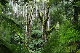 The rainforest is a haven for plants and wildlife, and is particularly well known for its giant mountain ash trees and lush fern gullies. There are a wide variety of birds residing in the park including the pilotbird, yellow tailed black cockatoo, eastern whipbird, and currawongs. In the evening possums, owls and bats emerge to feed.[12] Lyrebirds, wombats, swamp wallabies, gliders and platypuses can also be found within the park.