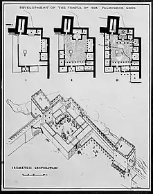 The temple's paintings were discovered in 1920 by M. C. Murphy. Photos of the paintings reached James Henry Breasted, who studied both the paintings and the temple and would publish a monograph about them in 1924.[1] Before Murphy's discovery, the site was unknown to Westerners. Its identification with the town of Dura Europos, as known from ancient sources, only came later. The discovery of wall paintings in the temple sparked interest and the find was even reported in The New York Times, in an article from 10 June 1922. This article noted that the paintings represented a transitional stage between 'decadent Oriental Hellenistic art' and Byzantine art.[2] The Temple of Bel was one of the first structures discovered at Dura in 1920. It was fully excavated but never published.[3] In the Parthian times the Temple was likely dedicated to Zeus,[4] as no evidence indicates Palmyrene worship during the Parthian period in which it was founded.[5] Based on the unpublished iconography that Ted Kaizer analyzed, he argues that the deity who reigned under "Zeus" was Bel.[6]