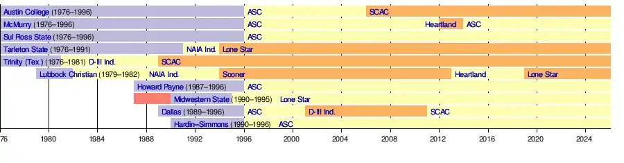 American Southwest ConferenceHardin–Simmons UniversitySouthern Collegiate Athletic ConferenceNCAA Division III independent schoolsAmerican Southwest ConferenceUniversity of DallasLone Star ConferenceMidwestern State UniversityAmerican Southwest ConferenceHoward Payne UniversityLone Star ConferenceHeartland ConferenceSooner Athletic ConferenceNAIA independent schoolsLubbock Christian UniversitySouthern Collegiate Athletic ConferenceNCAA Division III independent schoolsTrinity University (Texas)Lone Star ConferenceNAIA independent schoolsTarleton State UniversityAmerican Southwest ConferenceSul Ross State UniversityAmerican Southwest ConferenceHeartland ConferenceAmerican Southwest ConferenceMcMurry UniversitySouthern Collegiate Athletic ConferenceAmerican Southwest ConferenceAustin College