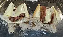 The Texas Tommy is prepared by slicing a hot dog lengthwise to split it; cheese is placed within the slit; and the hot dog is then wrapped in bacon, secured with toothpicks, and cooked and served on a warmed or toasted bun.[1][3] Cheddar cheese or American cheese may be used, and some versions are prepared using Cheez Whiz.[1][4][5][6] In the 1950s, Velveeta was sometimes used in their preparation.[6] Some versions are prepared by topping a hot dog with bacon and cheese. It may be cooked by barbecuing, grilling, broiling or deep frying.[1][3][7] Additional condiments may be used,[2] such as mustard, ketchup[1] and relish. Some versions may have a high cholesterol[1] and fat content.