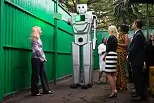The first generation of robots was commissioned in 2013 and cost about 15,000 dollars each to manufacture, while the latest generation unveiled on March 4, 2015, cost about 27,500 dollars each. They weigh 250 kg (550 lb) each, are 2.5 metres (8 ft 2 in) high and are made of aluminium to better withstand the equatorial climate. The autonomy of the robots is provided by a solar panel placed over their head. The solar panels that power the robots could prove a major asset in a city where whole districts still lack electrical power. Made of aluminium, the robots are designed to resist a harsh equatorial climate with high temperatures, humidity and massive downpours.[9] These humanoid traffic robots can rotate their chest and raise their arms like a human traffic officer would do to stop vehicles in one direction, and allow their flow in another one. Some of these robots can detect pedestrians and are programmed to “speak” to tell them when the road can be crossed or not. When they wait to cross, he sings a song that recalls the principles of road traffic.[7] The first goal is to implement the humanoid robots all around Kinshasa, but to achieve this, according to some experts, it is necessary to mobilize 12 million US dollars because Kinshasa has about 600 strategic and dangerous intersections, the price of a robot oscillating between 10,000 and US$20,000, including the cost of maintenance.[7]
