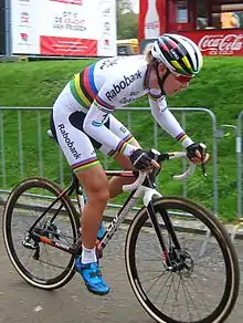 ![]() De Jong, in her world champion skin-suit riding during a 2016 cyclo-cross race at Cauberg | |||||||||||||||||||||