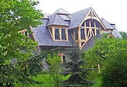 The first story is built of dressed, randomly coursed stone. It gives way to frame and a gambrel roof on the upper stories. A projecting, center-shingled pavilion on the west facade is trimmed in half-timber, coming to a louvered gable peak with its rafters intentionally exposed as decoration. A similarly decorated porch, with open gable, extends from the pavilion. The south profile has a one-story projecting bay supporting a balcony. The windows and doors on the first story have arched openings, echoed by a split rounded transom over the double-doored main entrance.[1]