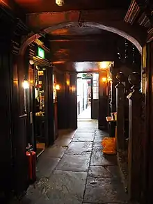 In the late-18th century, the house was converted into a pub, although much of its interior survives intact from the 1670 alterations, particularly in the entrance hall, the Smoke Room, and a room upstairs with a trompe l'oeil painting. Externally, the central section of the facade is timber-framed with a jettied first floor, dating from 1560. To its right is a brick and timber extension from 1670, and to the left, an extension built in 1940, with a wing of 1670 behind.[1][2][3]