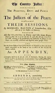 The Country Justice was written by Michael Dalton and first published in 1618. The subtext reads: Conteyning the Practise of the Justices of the Peace Out of Their Sessions, Gathered for the Better Helpe of Such Justices of Peace as Have Not Beene Much Conversant in the Studie of the Lawes of this Realme.[1]