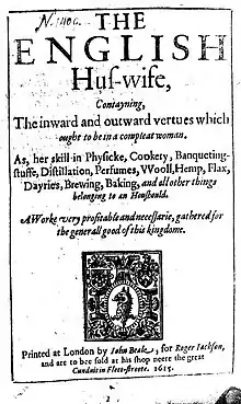 Linda Woodbridge, reviewing Michael Best's edition of The English Housewife, describes it as a splendid modern text. She describes the maladies for which Markham proposed remedies as "some picturesque, some desperate", as they included "stinking breath which cometh from the stomach", "pimpled or red-saucy face", "griefs in the stomach", "desperate yellow jaundice", "pissing in bed", "falling of the fundament", and "privy parts burned". The remedies make use of "curatives as homely as parsley, as exotic as dried stag's pizzle. She notes that in the two parts of Countrey Contentments, Markham expected the country gentlemen to lead a purely recreational life, the country gentlewoman to have "one long round of unremitting hard work." But Woodbridge notes that at least booksellers of the time were recognising "that a substantial market of literate female book-buyers was something worth catering to."[12]