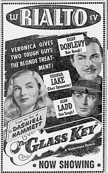 The Glass Key is a 1942 American crime drama based on the 1931 novel of the same name by Dashiell Hammett. The picture was directed by Stuart Heisler starring Brian Donlevy, Veronica Lake and Alan Ladd (who plays the actual lead despite being billed third). A successful earlier film version starring George Raft in Ladd's role had been released in 1935.[2] The 1942 version's supporting cast features William Bendix, Bonita Granville, Richard Denning and Joseph Calleia.