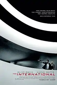 The International is a 2009 action thriller film[6] directed by Tom Tykwer and written by Eric Warren Singer. Starring Clive Owen and Naomi Watts, the film follows an Interpol agent and an American district attorney who jointly investigate corruption within the IBBC, a fictional merchant bank based in Luxembourg. It serves organized crime and corrupt governments as a banker and as an arms broker. The bank's ruthless managers assassinate potential threats, including their own employees.