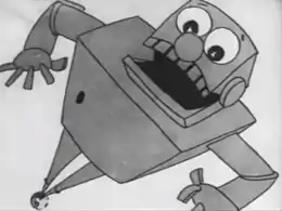 The film begins with a male cat walking down the street singing and playing a musicbox. He then descends onto a neighborhood. He plays there until Farmer Al Falfa, a recurring character in the Aesop series, looks out of his window, and describes the music as "rotten". He then gets out of his house, and asks the cat to leave. He compiles, by running off the screen. The farmer, then chases a pair of chickens, who were there when the cat first descended onto the neighborhood. They then fly up onto a branch of a tree. Once up there, one chicken lays an egg and flings it at the farmer. The farmer, for retaliation, acquires a saw, and climbs up the tree, nearly falling off it whilst climbing. Once at the same level as the chickens, he brings out his saw and begins to cut. As soon as they realise that the farmer is cutting off an individual branch, which would make the farmer fall off the tree. The chickens retreat to the trunk of the tree, but the tree branch comically stays standing, whilst the rest of the tree collapses. The farmer then descends from the branch to the ground, but the branch hits him and the animals, who were watching the ordeal, starts to laugh at him. The farmer then returns home. Once he is back home and sitting on the stair leading to his front door, the postal service arrives with a package which is delivered via a horse drawn carriage. That package is a machine, an iron man. Once the farmer opens up the package. The robot starts to dance, with the farmer following along. During the dance, the robot kicks the farmer. In retaliation, the farmer kicks the robot back. This causes the robot to malfunction, by gradually increasing in size, until it is bigger than the Earth. The robot then explodes. The farmer then laughs at the animals. Until, the debris comically falls from space and reassembles the robot. Both the farmer and the animals run from the robot in the closing shot of the cartoon.[1]