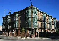 The Kirk was a historic building located in Mason City, Iowa, United States. Completed in 1903, this was the city's first luxury apartment building.[2] Horace P Kirk, who owned and managed the building, was a Mason City businessman, photographer, and civic leader. He built two other buildings here and to the north that were destroyed in a fire in 1902. This building was built on the site of Kirkland Flats, and parts of its stone foundation and north wall may be from the H.P. Kirk wholesale building that had been built in 1892.[2] Originally The Kirk supplied heat, light, and water for the apartments with its own steam generating plant. It subsequently acquired city utilities. The building featured an eclectic design that was organized into horizontal and vertical elements. The horizontal was realized in wide brick bands on the floors. The vertical was realized in the copper-clad oriel windows that tied the second and third floors to the cornice. The building was individually listed on the National Register of Historic Places in 1982,[1] and as a contributing property in the Mason City Downtown Historic District in 2005.[3]