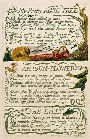 - ↑ Morris Eaves; Robert N. Essick; Joseph Viscomi (eds.). "Songs of Innocence and of Experience, copy F, object 47 (Bentley 43, Erdman 43, Keynes 43) "My Pretty ROSE TREE"". William Blake Archive.