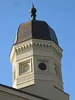 The towers: towers are flanking the façade and in the horizontal plan they are square. They are placed slightly forward from the face of the facility (risalit). They have 5 floors. On their ground floor, they are put forward with small portals and sloped roof. The portals décor is identical to the main portal. In the second and third floors there are mullions. On the west tower's window, there is a wooden openwork preserved in the whole opening. On the fourth floor there is a triforium. The fifth tier plan changes to an octagon. It is in a shape of a drum with oeil-de-boeuf (ox-eye) windows. The windows are placed in a square brick boxes on all eight sides (lanterns). A frieze cymatium, similar to the body of the synagogue connects the dome with the tower. Onion shaped octahedral dome is covered with gray half round tiles (arranged like fish scale). The whole is topped with a spire coming from the center.