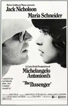 The Passenger (Italian: Professione: reporter) is a 1975 drama film directed by Michelangelo Antonioni. Written by Antonioni, Mark Peploe, and Peter Wollen, the film is about a disillusioned Anglo-American journalist, David Locke (Jack Nicholson), who assumes the identity of a dead businessman while working on a documentary in Chad, unaware that he is impersonating an arms dealer with connections to the rebels in the current civil war. Along the way, he is accompanied by an unnamed young woman (Maria Schneider).