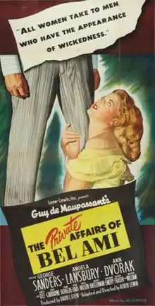 The Private Affairs of Bel Ami is a 1947 American drama film directed by Albert Lewin.[1] The film stars George Sanders[1] as a ruthless cad who uses women to rise in Parisian society, co-starring Angela Lansbury and Ann Dvorak. It is based on the 1885 Guy de Maupassant novel Bel Ami.[2] The film had a 1946 premiere in Paris, Texas.[3] The score is by Darius Milhaud.[4]