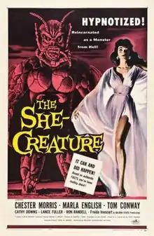 The She-Creature, or The She Creature, is a 1956 American black-and-white science fiction horror film, released by American International Pictures from a script by Lou Rusoff (brother-in-law of AIP executive Samuel Z. Arkoff). It was produced by Alex Gordon, directed by Edward L. Cahn, and stars Chester Morris, Marla English and Tom Conway, and casting Frieda Inescort and El Brendel in smaller roles. The producers hired Marla English because they thought she bore a strong resemblance to Elizabeth Taylor.