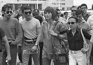 On May 4, 1970, actress and anti-Vietnam War activist Jane Fonda visited students at the University of New Mexico. Fonda encouraged students to engage in "non-violent and vigorous protest of Nixon's Cambodia policies."[11] During Fonda's speech, students began planning a strike that was set to begin early on May 6, and created a list of demands for University President Ferrel Heady. After the speech, Fonda and about 150 students proceeded to march to Heady's home where they delivered their demands and protested late into the night.[1][11][12] Following the protest, student body president Eric Nelson and The Daily Lobo editor Michael Blake formally encouraged students to participate in a strike with the purpose of protesting Nixon's invasion in Cambodia and the violent Kent State shooting that had happened earlier that day.[13] The students adopted the theme "They Shoot Students, Don't They?" for the strike, a play on words reference to Fonda's star role in the 1969 film They Shoot Horses, Don't They?[13][14]