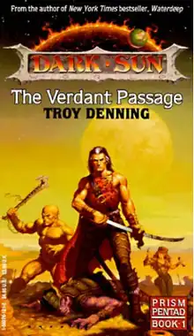 In 1991, TSR published a new setting for the Dungeons & Dragons role-playing game, the post-apocalyptic Dark Sun campaign set on the desert world of Athas.[2] As part of the promotional support for the setting, TSR also published a series of five novels set on Athas, beginning with The Verdant Passage, a 341-page mass market paperback written by Troy Denning, with cover art by Brom. It was the first book in Denning's five-part "Prism Pentad":[3]
