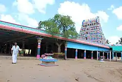 The temple was originally believed to have been built by Cholas. Most of the Chola temples built during the period of 866 and 1004 CE is associated with certain military events or political campaign.[4] Govinda Dikshitar, the minister of Raghunatha Nayak took special interest in the temple as he was staying at Pateeswaram. Various bathing ghats and Pushyamandapas were built during his regime in various temples in the region.[5] There are two inscriptions in the temple dating back to the 12th century. The first recorded inscription numbered 21 G of 1908 is from the period of Veeraprathapa Devarayar during 1199 indicating the building of a temple tank, a hall and gifts to the temple. 21 H.08 is made during 1137 during the same regime indicating modifications done to the temple and gifts worth 9.5 velis of land to the temple. There are five inscriptions dating back to 16th century during the Nayak period. One of them indicates the prevalent culture of presenting the goddess with a saree when families in the village arrange a marriage. Another inscription glorifies the temple and equates the holiness of this temple with Vridagiriswarar temple, Thyagarajar temple, Thiruvengadu temple at Thiruvengadu, Thiruchayakadu and Kailasa. There is another inscription near the Balipeeda that indicates about the prevalence of Thirunavukarasara Mutt, Thirugnanasambandar Mutt and Thirumoolathevar Mutt.[6] The temple owns around 41 acres and 61 cents of Nanjai lands and 100 acre and 91 cents of Punjai lands. The temple was originally administered by Kumbakonam Devastana committee till 7 August 1945 when it was shifted to Hindu Religious and Charitable Endowments Department, Government of Tamil Nadu.[7]