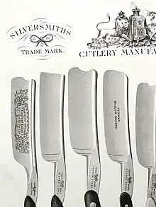 Skinner's UK patent of August 1851 was announced in Newton's List of patents.[24] The guidebook to the 1851 Great Exhibition said: "Our readers will notice the beautiful designs on some of the steel articles, razors &c, sent from Sheffield. The method of executing this etching and gilding on steel, is the invention of Mr. Thomas Skinner, of Sheffield".[25] The article he contributed was:[26]