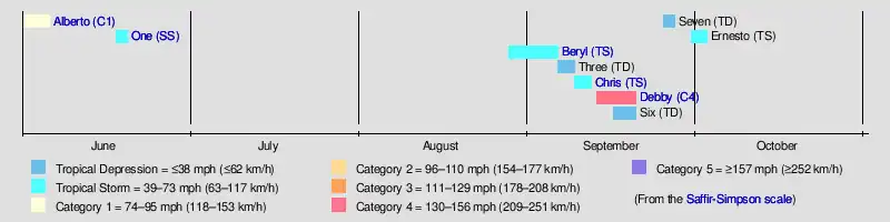 This season produced eight tropical depressions, of which five became named storms; two attained hurricane status, of which one became a major hurricane, a storm that ranks as a Category 3 or higher on the Saffir–Simpson scale.[1] Hurricane Alberto, the season's first named storm, was one of four storms on record to attain hurricane status in the Gulf of Mexico that not make landfall. The other three were Laurie of 1969,[1] Henri of 1979,[3] and Jeanne of 1980.[4] Nonetheless, rains from Alberto caused severe flooding, which killed 23 people in Cuba.[5] The season's only major hurricane, Debby, reached peak intensity as a weak Category 4 over the open waters of the Atlantic.[6] Tropical Storm Ernesto, the last storm of the season, peaked in intensity on October 2 just below hurricane strength. It then dissipated the next day,[7] 58 days before the official end of the season.[8]