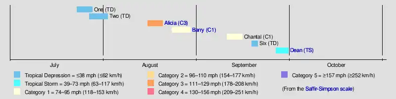 The 1983 Atlantic hurricane season was an event in the annual tropical cyclone season in the north Atlantic Ocean. It was the least active Atlantic hurricane season in 53 years, during which four storms formed.[1] The season officially began on June 1, 1983 and ended November 30, 1983. These dates, adopted by convention, historically describe the period in each year when most systems form.[2] The first named storm, Hurricane Alicia, formed on August 15. The last storm of the season, Tropical Storm Dean, dissipated on September 30.