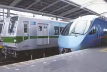 Toei 6300 series (left) and Tokyo Metro 9000 series (right) trains at Tamagawa Station