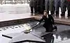 Burning in a shrine under the arch of India Gate since 1971 is the Amar Jawan Jyoti (the flame of the immortal soldier) which marks the Tomb of the Unknown Soldier. The shrine itself is a black marble cenotaph with a rifle placed on its barrel, crested by a soldier's helmet. Each face of the cenotaph has inscribed in gold the words "Amar Jawan" (Immortal Warrior) in Hindi (Devanagri script). The Prime Minister of India pays homage to the country's fallen soldiers along with the Chiefs of Staff of each arm of the Armed Forces on each Republic Day of India. | |