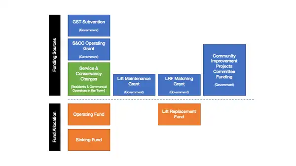 The funding sources of town councils are largely dominated by the government, even though the service and conservancy charges are collected from residents and commercial operators of the town.