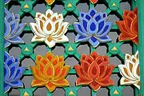 Patterns may also represent a sign, despite whether or not the pattern features fictional subjects. This is mostly shown with a dragon or phoenix patterns, which is often regarded as a lucky sign depending on the story behind it. Peach patterns invoke meditation and longevity, representing a mythical peach that was said to grow in heaven (Xi Wangmu legend, 서왕모 전설). A carp pattern symbolizes success in life, as presented in a myth. These representations are derived from the artists who created the patterns, or the people who witnessed and experienced such things.[1] Since the Three Kingdoms Period, traditional Korean patterns were generally involved with Buddhism, in addition to Confucianism and Taoism.[3]