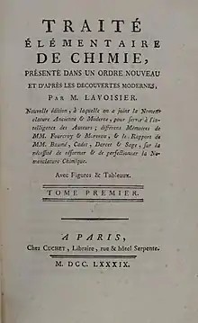 - ↑ See Lavoisier, Antoine (1789), Traité Élémentaire de Chimie, présenté dans un ordre nouveau, et d'après des découvertes modernes (1 ed.), Paris: Cuchet, Libraire, retrieved 2012-04-15 via Gallica