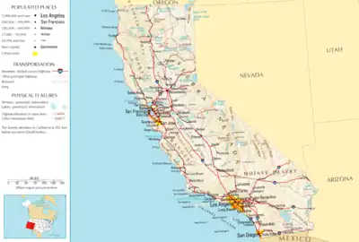 Map of California showing the primary cities and roadways
