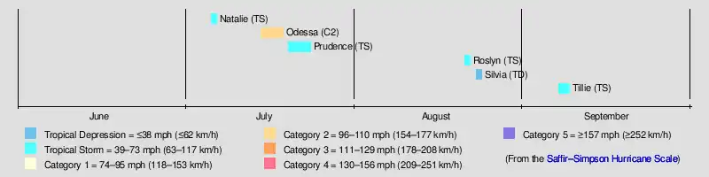 During this season only six tropical storms developed, of which two intensified into hurricanes. Of the two hurricanes, one reached Category 2 intensity of the Saffir-Simpson Hurricane Wind Scale. No storms reached major hurricane status (Category 3 or higher on the hurricane scale), an unusual occurrence. The first tropical cyclone of the season, Tropical Storm Natalie made landfall in Mexico in early to mid-July. About a week later, Hurricane Odessa became the strongest storm of the season in terms of wind speed. Tropical Storm Prudence brought high waves to Southern California, while becoming the strongest storm of the year in terms of barometric pressure. In addition, Tropical Storm Tillie produced severe flooding to much of the Southwestern United States, in particular in Arizona in early to mid-September.