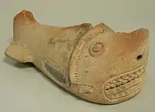 The first scholars of the Tumaco-La Tolita culture thought that its art was nothing more than the representation of the natural environment and daily life.[2] Within this line of thought, it was believed that anthropozoomorphic representations (representations of humans with animal parts) were actually representations of shamans who were undergoing a process of spiritual transformation inspired by the consumption of hallucinogenic plants. But this way of understanding the Tolita art has been questioned by current scholars, who believe that Tolita iconography truly represents the opposite of everyday life:deities, mythological ancestors, supernatural characters, and legendary heroes.[15]