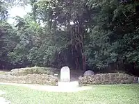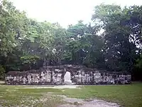 Tikal Group Q (also known as Group 4E-4)[18] is situated to the east of Group R, another twin-pyramid group on the east side of the Maler Causeway.[23] It is largest twin-pyramid complex at Tikal and was associated with king Yax Nuun Ayiin II, who is portrayed on Stela 22, erected within the complex's enclosure.[29] Stela 22 and the paired Altar 10 outstanding examples of Late Classic Maya sculpture, although the sculpted figure was mutilated in ancient times.[16] The group has been largely restored, with its monuments re-erected, and restoration of the east pyramid, north enclosure and south range.[16] Group Q dates to 771.[16]