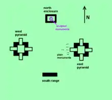 Twin-pyramid complexes had identical radial pyramids on the east and the west sides of a small plaza;[6] these pyramids had a stairway climbing each of its four sides.[7] Usually they had a range building on the south side that possessed nine doorways and a small enclosure on the north side that housed a sculpted stela-altar pair.[4] These sculpted monuments recorded the king performing the kʼatun-ending ceremony.[8] Up to nine plain stela-altar pairs were erected in a line at the foot of the eastern pyramid, facing west;[9] at Tikal no stelae were ever placed in front of the western pyramid.[8] The whole twin-pyramid complex may be a miniature representation of Tikal's Great Plaza, mirroring the placement of pyramids on the east and west sides, an ancestral shrine to the north and a simple palace on the south side.[8] The twin pyramids were never designed to support a summit temple.[10]