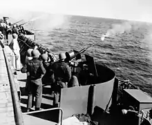 One 5 in (127 mm)/38 caliber dual-purpose gun was mounted on the stern. Anti-aircraft defense was provided by eight Bofors 40 mm (1.6 in) anti-aircraft guns in single mounts, as well as twelve Oerlikon 20 mm (0.79 in) cannons, which were mounted around the perimeter of the deck.[6] By the end of the war, Casablanca-class carriers had been modified to carry thirty 20 mm (0.79 in) Oerlikon cannons, and the amount of Bofors 40 mm (1.6 in) guns had been doubled to sixteen, by putting them into twin mounts. These modifications were in response to increasing casualties due to kamikaze attacks. Casablanca-class escort carriers were designed to carry 27 aircraft, but the hangar deck could accommodate more. During the Mariana and Palau Islands campaign and the Invasion of Lingayen Gulf, she carried 16 FM-2 Wildcat fighters and 12 TBM-1C Avenger torpedo bombers for a total of 28 aircraft.[7][8]