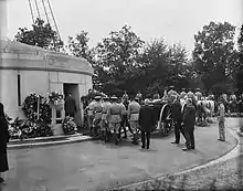 The funeral train reached Rosslyn, Virginia, on December 27. The remains were transferred to wagons, and taken to Arlington National Cemetery.[29] The funeral cortege include a cavalry unit from Fort Myer, a unit of 25 Marines from the Washington Navy Yard, and a unit of bluejackets (U.S. Navy sailors) from the USS Texas.[78][79] The coffins were carried through the Sheridan Gate[80] placed under tents and an honor guard of Marines protected them overnight.[29][81]