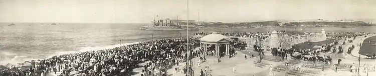 The funeral was largely the same as that used for burying the Santiago campaign's dead.[80] Protestant funeral rites were read first by Chaplain H.H. Clarke,[29] followed by Catholic rites said by Father Chidwick.[79] The sailors fired a 21-gun salute, the Marine Corps Band played a funeral dirge, taps were played by a bugler, and the reinterment ceremony ended.[78][79] More than 25,000 people watched the burial.[85] Crowds of mourners passed by the coffins during the rest of the day, laying flowers and tributes. It was not until early evening that the coffins were placed in the graves and buried.[29]