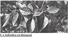 8. "Herbarium specimen BR0000026204994V". Botanic Garden, Meise. Sheet labelled Klemmer rouge, Ypres area (C. Aigret; 1905); "Herbarium specimen - L.1587073". Botany catalogues. Naturalis Biodiversity Center. Short-shoot leaves; sheet described as U. × hollandica Mill. 'Klemmeri' Rehder, Arnold Arboretum, 1930; "Herbarium specimen - WAG.1847085". Botany catalogues. Naturalis Biodiversity Center. Sheet described as U. × hollandica Mill. 'Klemmeri', Wageningen Arboretum, 1962; "Herbarium specimen - WAG.1847078". Botany catalogues. Naturalis Biodiversity Center. Long shoot. Sheet described as U. × hollandica Mill. 'Klemmeri' (from Späth)
