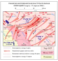 The Uman–Botoșani offensive[16] or Uman–Botoshany offensive[17] (Уманско-ботошанская наступательная операция) was a part of the Dnieper–Carpathian offensive, carried out by the Red Army in the western Ukrainian Soviet Socialist Republic against the German 8th Army of Army Group South during World War II. Led by Marshal of the Soviet Union Ivan Konev, it became one of the most successful Red Army operations of the whole war. In over a month of combat through the deep spring mud and numerous water barriers, the 2nd Ukrainian Front advanced over 300 kilometres (190 mi), cleared German forces from southwestern Ukraine, and entered Romania and Moldova.