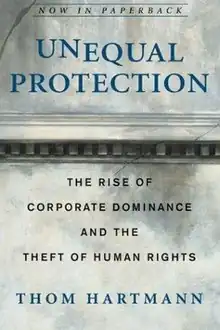 Unequal Protection: The Rise of Corporate Dominance and the Theft of Human Rights is a 2004 book by Thom Hartmann. The book explains that the largest and most powerful transnational corporations dominate the lives of most of the world's citizens. According to the book, their CEOs are "unapproachable and live lives of nearly unimaginable wealth and luxury"; they value growth and profit no matter what the cost, and this has become disruptive for life on Earth.[1][2][3]
