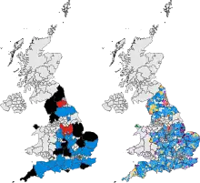 Map showing council control (left) and largest party by ward or division (right) following the election.