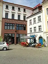 Only a few commercial tenants survived the reunification and with it the tougher competition of the market economy. These included the Ullrich funeral home, the Gruske butcher shop and the inns Zum Nachtschmied and Café Schwibbogen. The Ullrich funeral home was now the oldest business on the Upper Market Square. However, many new tenants were found, including some restaurants and cafés, a flower store, an interior decorator, a small grocery store, a health insurance company and other businesses. Some only made it a few years, such as Sport-Petzold and Spielwaren Zippel. This store with the owner and saleswoman Gisela Zippel was considered an institution by many Görlitz citizens. She moved from Schulstraße corner Berliner Straße to the square in 1993 and closed her store in 1997 after her retirement and 60 years in business. The number of residential tenants also declined despite increasingly good renovation conditions. This was also due to the decline in population throughout the city, but probably also to noise pollution from traffic and the large parking lots in the square. However, the Upper Market Square is still the starting point and gateway to the historic town of Görlitz,e.g. to the Lower Market Square with a remarkable number of renaissance buildings, as well as the site of numerous events, for example the street theater festival Via-Thea, the Silesian Tippelmarkt, parts of the Christkindelmarkt and the Görlitz Historic Town Festival.[4]:125f