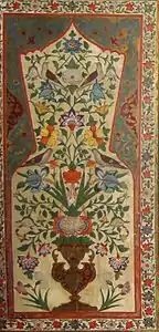 National traditions of wall painting, which is the most valuable legacy of Azerbaijani art, took the main place in the creativity of Usta Gambar Karabakhi. Chased decoration and richness of compositional and color resolutions can be seen in his delicate graphic painting of a complex plant ornament. The painter drew pictures of animals and fantastic beings upon branched ornaments of flowers and plants. The painting also didn't destroy flatness of the wall, but on the contrary, underlined its constructive architectural details.[7]
