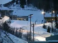 The following year, on June 15, 1991, Salt Lake City lost its 1998 Winter Olympics bid by four votes to Nagano, Japan.[2] Still, construction on the park commenced following a groundbreaking ceremony on May 29, 1991. The original estimated cost of the park was $26.3 million and included the ski jumps, bobsled/luge track, and a day lodge; following the completion of the ski jumps they were formally dedicated in a ceremony on January 9, 1993.[3] The track was designed by German luge coach Josef Lenz.[4]