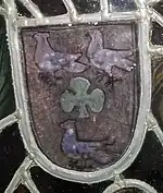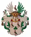 The family coat of arms consists of a green cloverleaf in a silver field, accompanied by three doves of natural color.[7]
