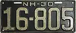 1918 | White serial on green porcelain plate; "N H" and "1918" centered at top and bottom respectively | none | 12345 | 100 to approximately 24700 | Some later plates manufactured on fiberboard.[2] |