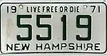 1971 | As 1957 base, but with "71" at top right | "LIVE FREE OR DIE" centered at top | AB123 | County-coded | First use of the state motto on regular passenger plates. The motto had first been used on vanity plates on the 1970 base. |